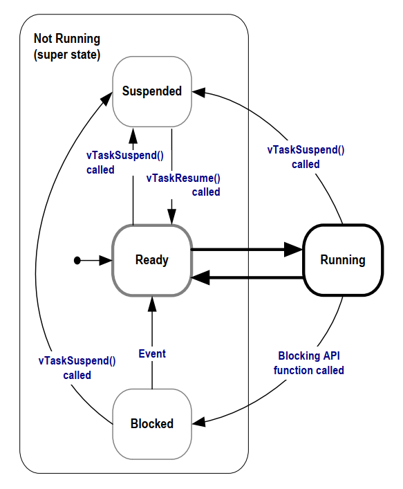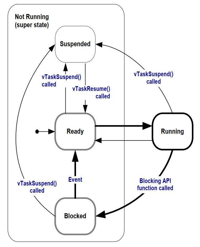 一个应用可能包含很多任务。如果运行该应用的处理器是单核, 那么任意时刻只能有一个任务在执行。 这意味着任务可处于两种顶层状态之一:运行(Running) 与 未运行(Not Running)。 我们先考虑这一简化模型。本章后续将介绍 未运行 状态的多个子状态。