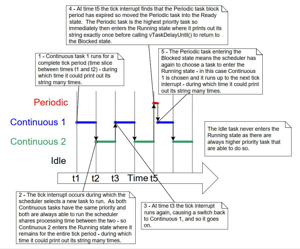 需注意,调度器选择新任务并不只发生在时间片末尾。 本书将反复演示:当当前任务进入 阻塞 状态后,或中断将更高优先级任务 移入 就绪 状态后,调度器也会立即选择新任务运行。 ↩