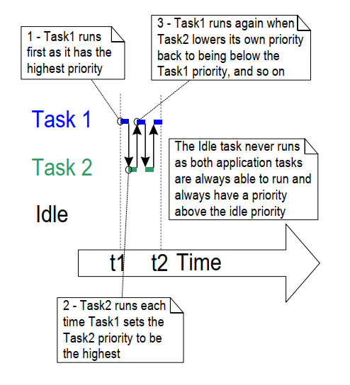 空闲任务和任务 2 都是持续处理任务, 且优先级都为 0(最低优先级)。 只有当没有更高优先级任务可运行时, 调度器才会给优先级 0 任务分配处理时间; 且这部分时间通过时间片在它们之间共享。 每次 tick 中断都会开启新的时间片, 在图 4.19 中发生于 t1、t2、t3、t4、t5、t8、t9、t10、t11。