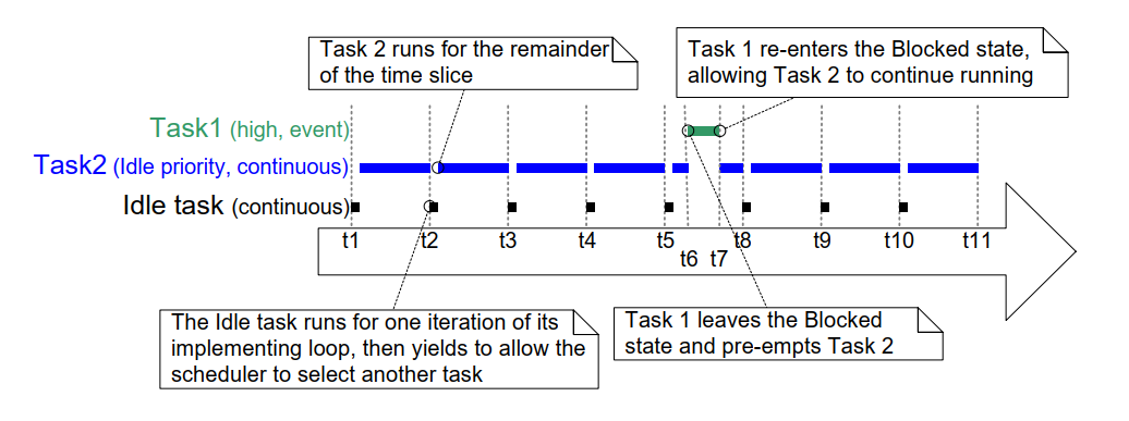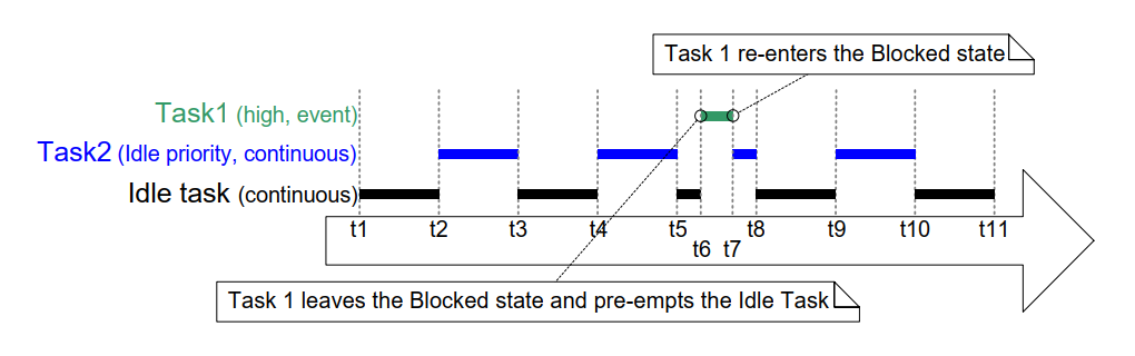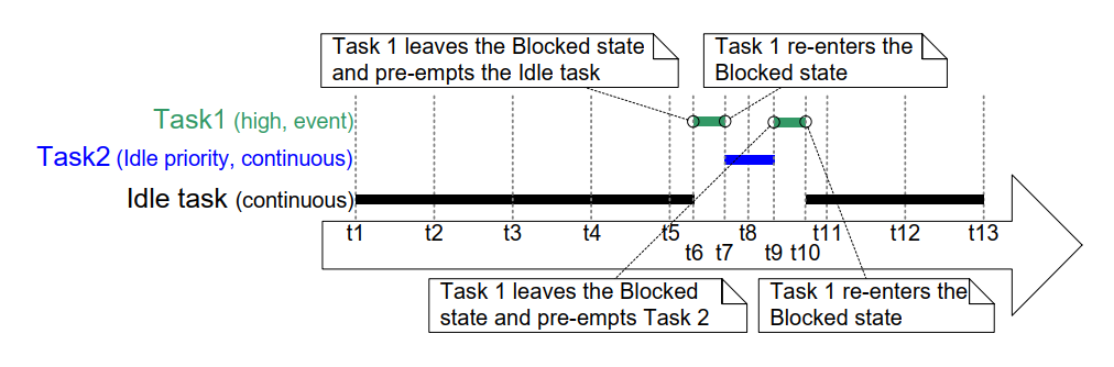 目标事件在 t6 发生。 t6 时任务 1 成为可运行任务中优先级最高者, 因此在一个时间片中途抢占空闲任务。 事件处理在 t7 完成,随后任务 1 重新进入阻塞态。