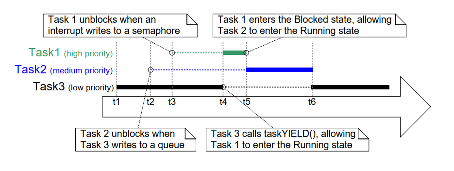 t6 时任务 3 处于运行态, 但任务 2 相对优先级更高,因此抢占任务 3 并立即执行。 任务 2 在 t7 完成处理并重新进入阻塞态, 随后任务 3 可重新进入运行态继续处理。 任务 3 在 t8 自身阻塞。