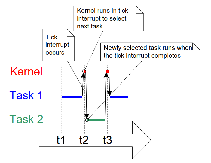 任务 2 在 t7 开始运行,即任务 1 回到阻塞态等待下一个事件时。 任务 2 一直运行到 t9 再次被任务 1 抢占, 这还不到一个 tick 周期。