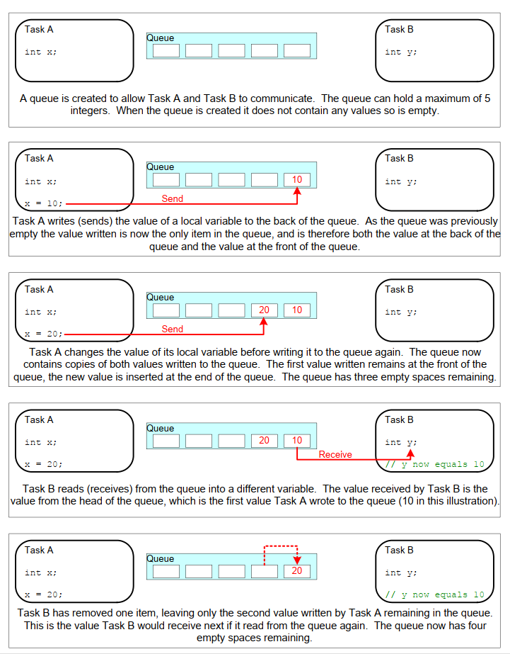 队列可保存的每项数据大小在创建时已设定,因此会从 pvItemToQueue 指向地址复制相应字节数到队列存储区。
