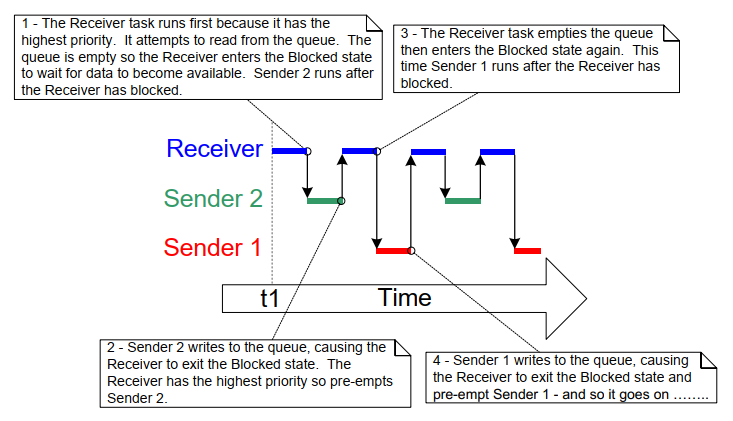 队列可有多个读者,因此同一个队列上可能有多个任务同时阻塞等待数据。此时仅有一个任务会在数据可用时被解除阻塞,且总是等待数据的最高优先级任务先被解除阻塞。若两个或更多阻塞任务优先级相同,则等待时间最长的任务先被解除阻塞。