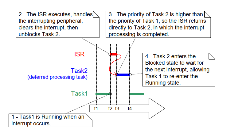 若承接延后处理的任务优先级高于其他所有任务,则处理几乎会立即执行,效果接近“在 ISR 内直接处理”。图 7.1 展示了该场景:任务 1 为普通应用任务,任务 2 为承接中断延后处理的任务。