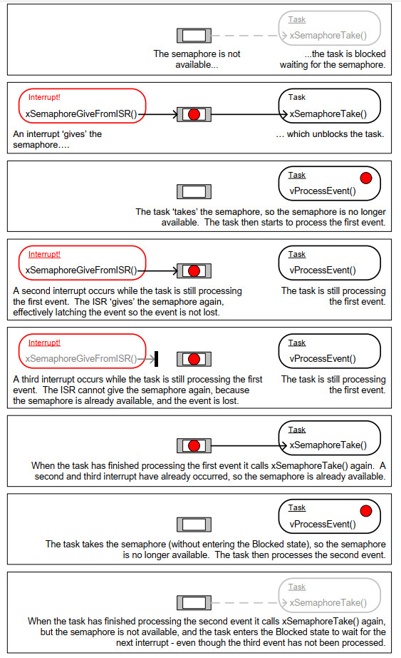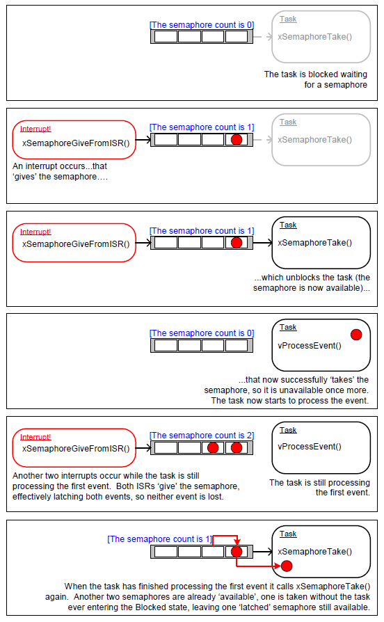 另一种办法是使用计数信号量或直接到任务通知来计数事件。计数信号量在下一节介绍;直接到任务通知在第 10 章介绍。直接到任务通知在运行时效率和