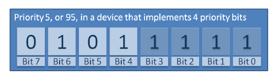 当只实现了部分位时,只有字节高位(最高有效位)可用,低位(最低有效位)未实现。未实现位可为任意值,但通常置为 1。图 7.15 展示了一个实现了 4 位优先级的 Cortex-M 微控制器如何存储二进制优先级 101。