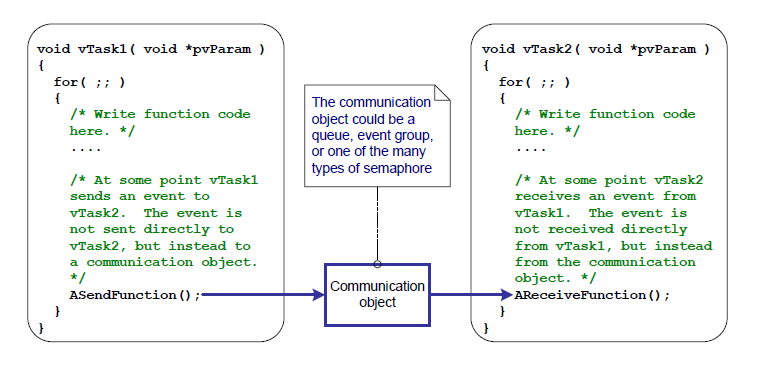 通信对象可被任何知道其句柄的任务或 ISR 访问(句柄可能是队列句柄、信号量句柄或事件组句柄)。任意数量的任务和 ISR 都可以处理发送到某个通信对象的数据或事件。