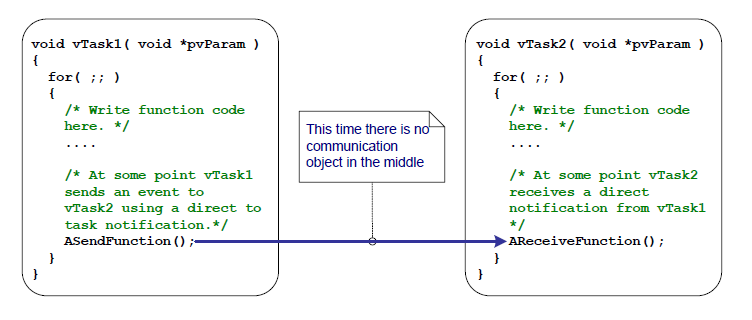 本书前文已经介绍了多种任务间通信方式。到目前为止介绍的方法都需要先创建一个通信对象。通信对象的例子包括队列、事件组和多种不同类型的信号量。