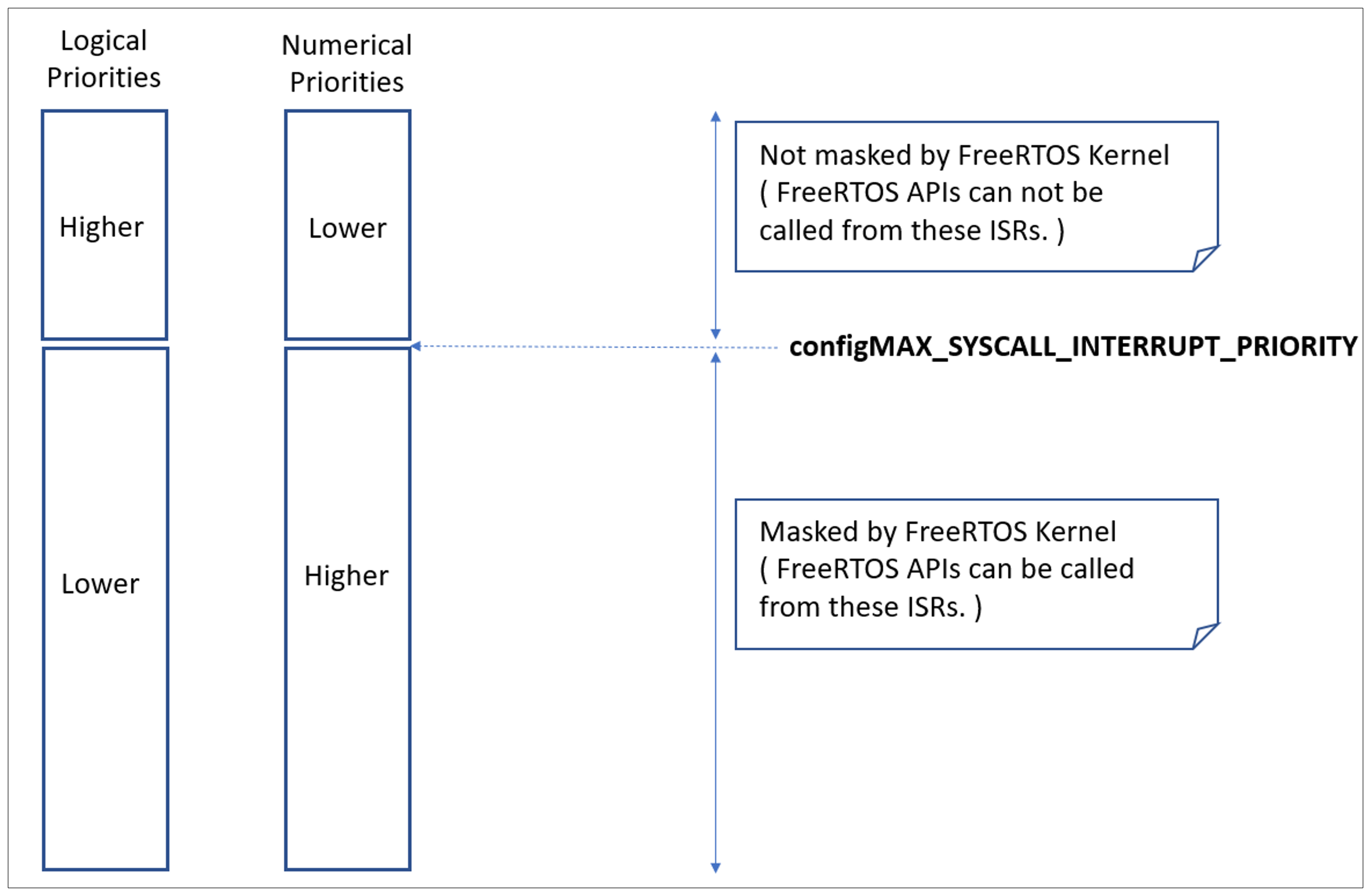 如果所用 FreeRTOS 端口支持中断嵌套,且某个中断服务程序使用了 FreeRTOS API,那么该中断优先级必须配置为不高于(逻辑上不高于)configMAX_SYSCALL_INTERRUPT_PRIORITY,详见 7.8 节“中断嵌套”。若不满足该要求,将导致临界区失效,继而引发间歇性故障。